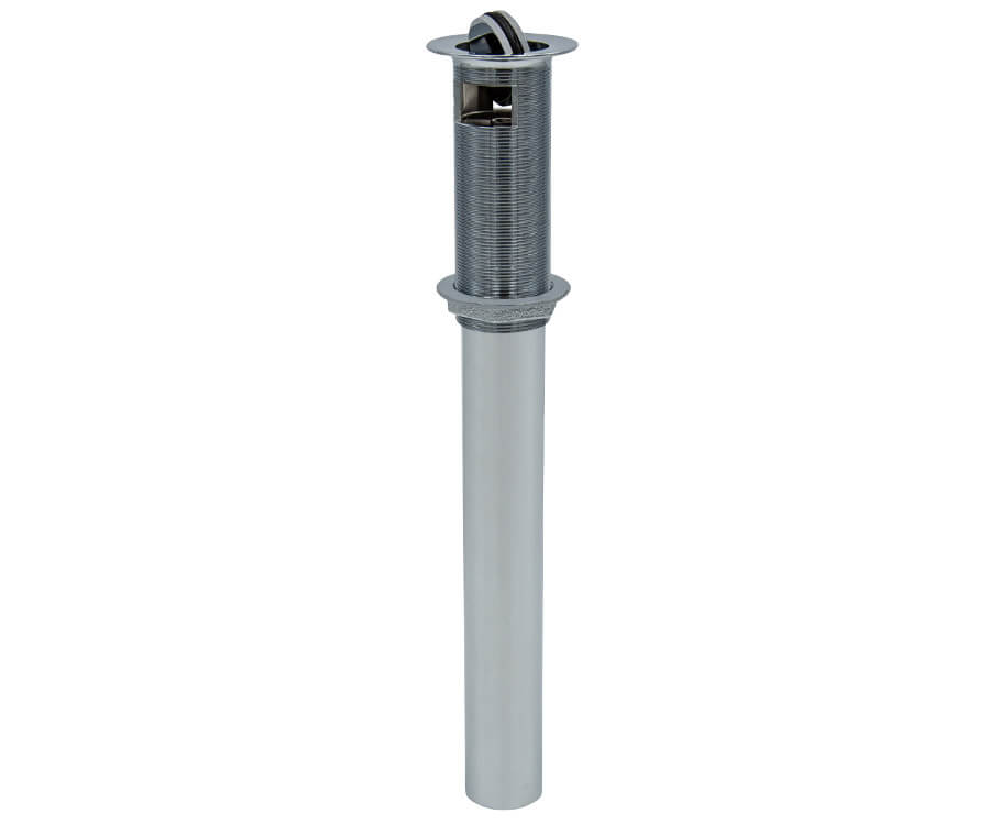 A finger touch lavatory drain for sinks and vessels with overflow. Fully plated brass drain body and tailpiece. Features round flip drain that opens and closes. Tailpiece measures 8" Long x 1-1/4" O.D. Drain Opening 1-1/2" diameter 4" Threaded Drain Body Comes With Overflow