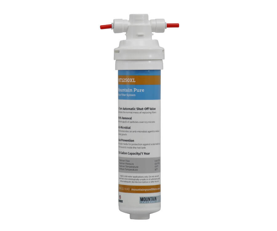 The pinnacle of convenience and satisfaction, Mountain Pure® brings fresh, pristine water to you directly through your own faucets. Access to clean water is of the utmost importance in everyday life, and having the freshest, best tasting water available anytime can save you both time and money. Just think how much you spend on bottled water from week to week - savings and ease can be found when you have your own filtration system. Mountain Pure® allows you to enjoy clean, safe water for drinking, cooking and even face washing when you install in your bathroom. Mountain Pure® Carbon Filtration Systems comes with a carbon filter cartridge that incorporates powder activated carbon and a bacteriostatic agent that protects it from bacteria growth. 1/4 Turn automatic shut-off valve allows for easy replacement and eliminates the usual mess of replacing filters. Includes MT1250XL/RFC Filter Mountain Pure® Filter Features: